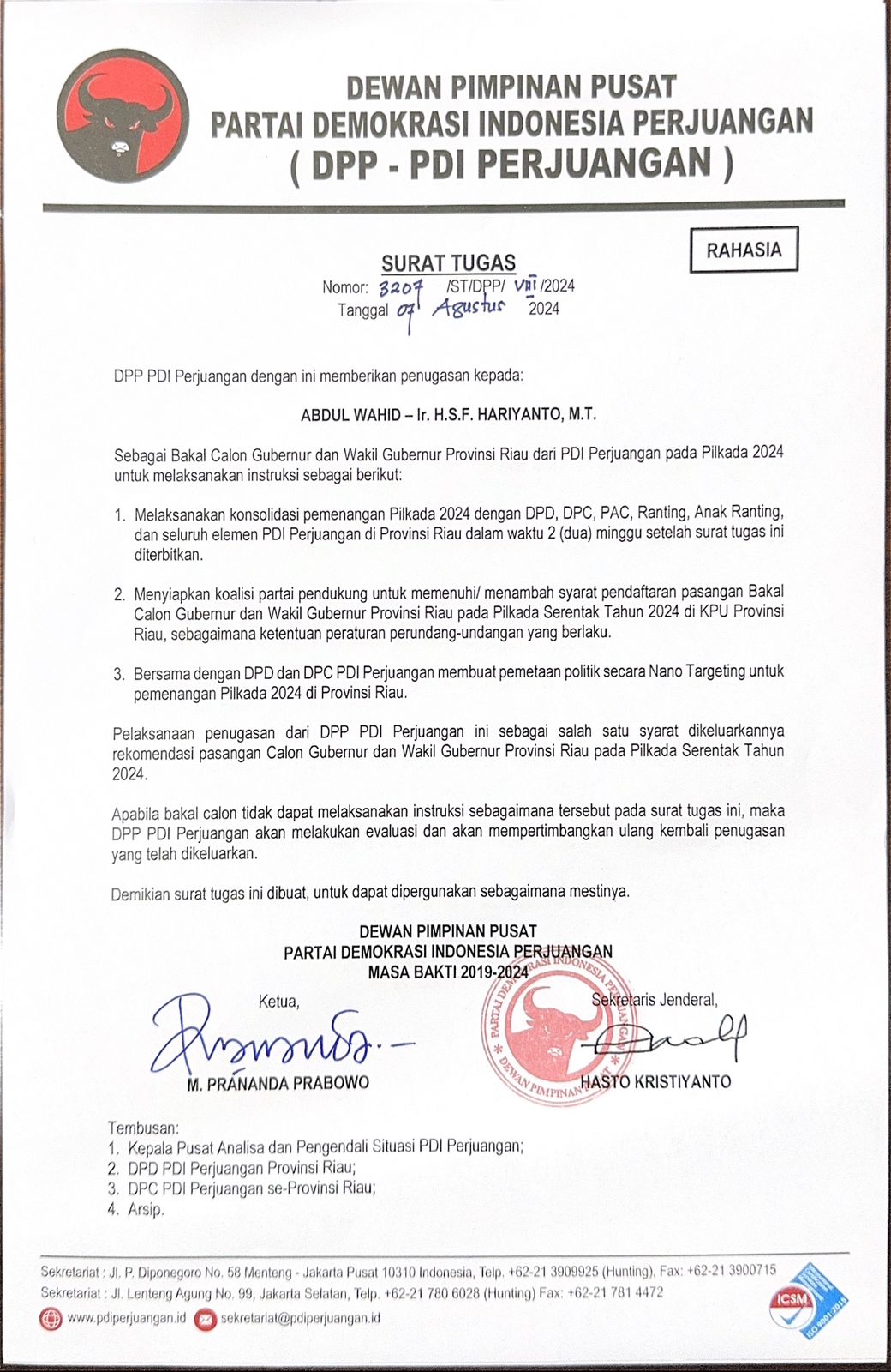 Dalam Surat Tugas itu memberi intruksi untuk melaksanakan konsolidasi Pemenangan Pilkada 2024 dengan DPD,DPC,PAC, Ranting, Anak Ranting dan seluruh Elemen PDI Perjuangan di Provinsi Riau, dalam waktu 2 minggu setelah Surat Tugas ini di terbitkan. (wan)