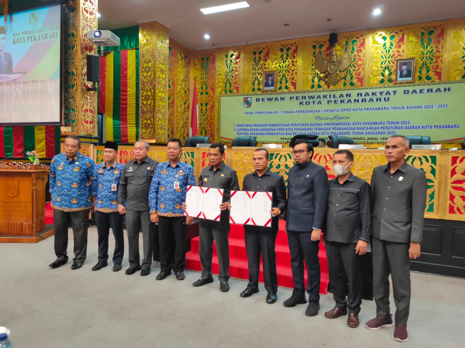 PJ Walikota Pekanbaru, Muflihun dan ketua DPRD Pekanbaru menandatangani APBD 2023 secara bersama