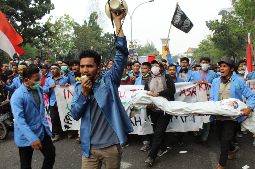 Meski saat libur bahkan tidak boleh masuk kampus, mahasiswa Uin Suska Riau tetap punya semangat dan peduli yang sama untuk turun aksi menyampaikan aspirasi depan kantor gubernur.