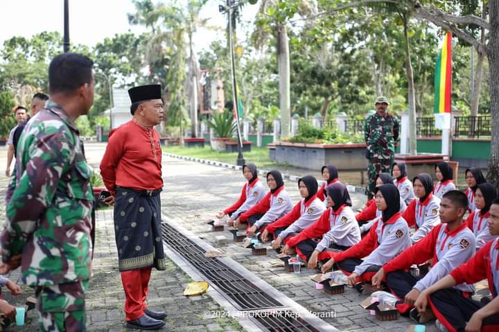 MERANTI (HALUANPOS.COM)- Di sela-sela kesibukannya sebagai kepala daerah, Pelaksana tugas Bupati Kepulauan Meranti AKBP (Purn) H. Asmar menyempatkan diri untuk melihat langsung pendidikan dan pelatihan Paskibra yang akan bertugas 17 Agustus mendatang.