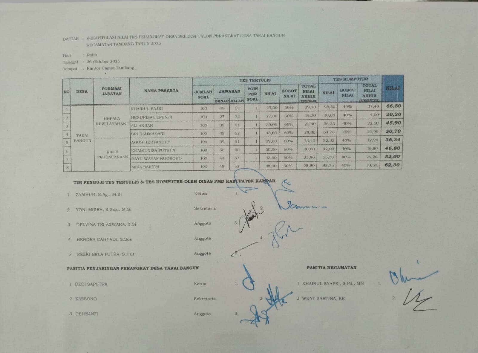 Dimana, dari hasil tes yang muncul ke publik, nama Khairul Fajri berhasil meraih nilai tertinggi dibanding kompetitor lainnya dalam tes calon perangkat desa Tarai Bangun, tahun 2025.
