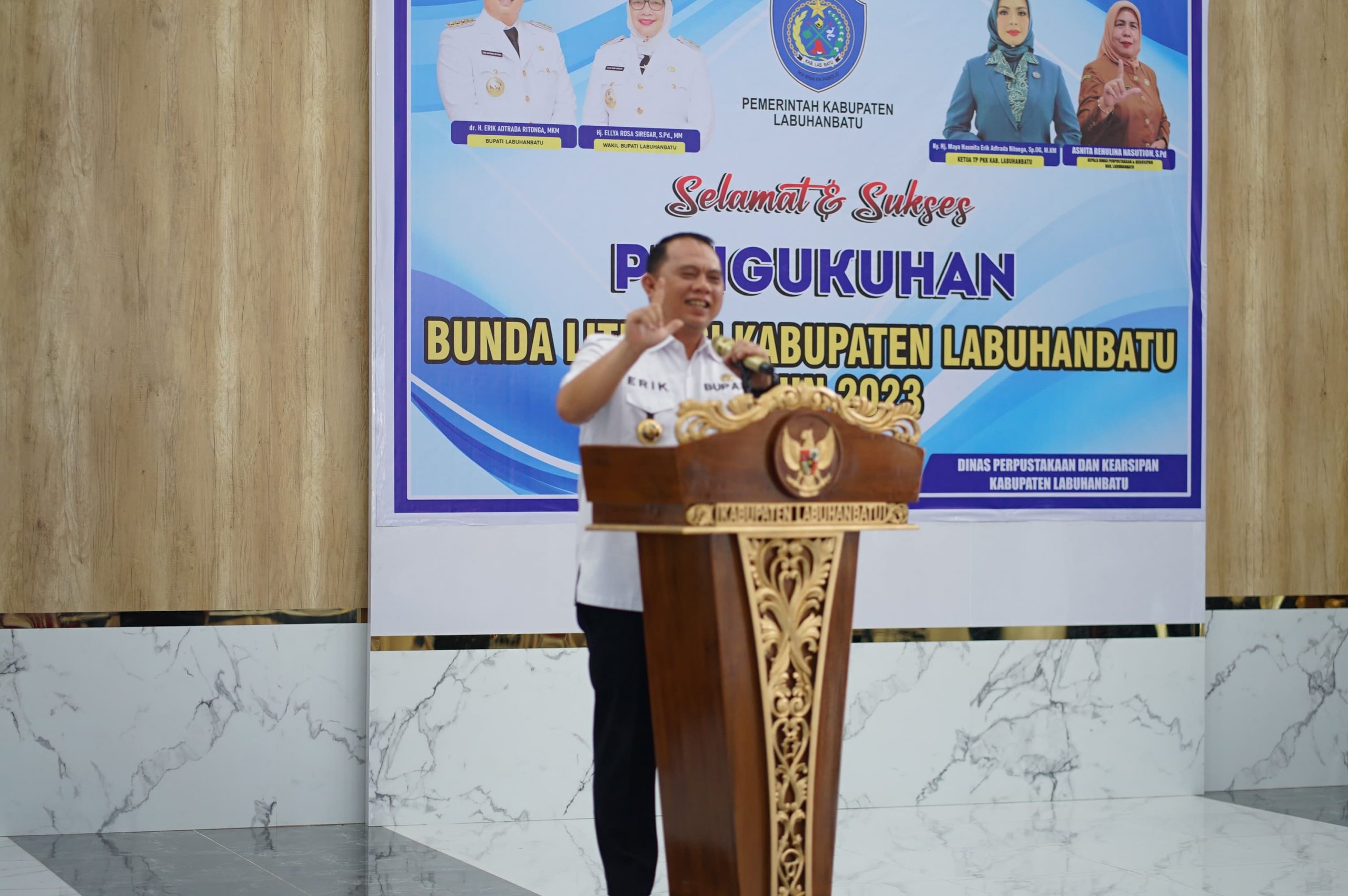 Labuhanbatu, Haluanpos.com- Bupati Labuhanbatu dr. H. Erik Adtrada Ritonga, MKM. bersama Wakil Bupati Labuhanbatu Hj. Ellya Rosa Siregar, S. Pd., MM. menghadiri pengukuhan Bunda Literasi LabuhanbatuLabuhanbatu di Aula Rumah Dinas Bupati Labuhanbatu, Rantau Utara, Rabu (01/11/2023).