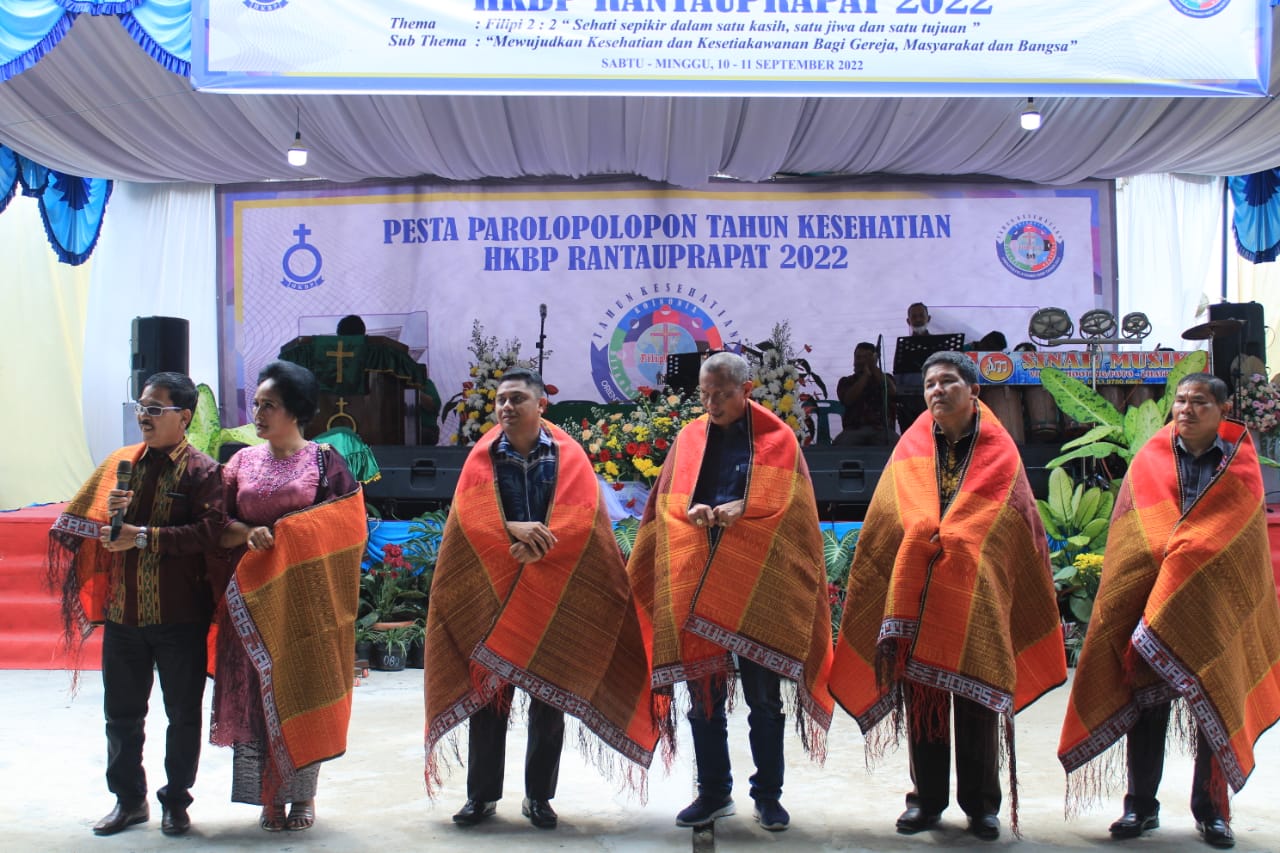 Acara dilanjutkan dengan pemberian Ulos oleh Sekjen HKBP Pdt. Dr. V. Tinambunan, M. ST kepada Bupati Labuhanbatu dr. H. Erik Adtrada Ritonga, M.K.M. dan berlanjut Pemberian Ulos kepada Perwakilan Dandim, Perwakilan Polres, Asisten l, Plt Diskominfo dan terakhir Kaban BAPPEDA.