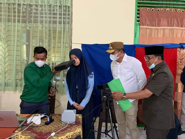 SELATPANJANG (HALUANPOS.COM) – , Dalam rangka mensukseskan 7 Program Strategis Bupati dan Wakil Bupati, point 6 memberikan pelayanan prima, cepat, tepat dan akurat, Disdukcapil Kabupaten Kepulauan Meranti kejar bola ke sekolah- sekolah untuk melakukan perekaman E-KTP. Pada kesempatan ini turut hadir Bupati Kepulauan Meranti H. Muhammad Adil, S.H., untuk meninjau perekaman E. KTP di SMA 2 Selatpanjang, Rabu (29/09)