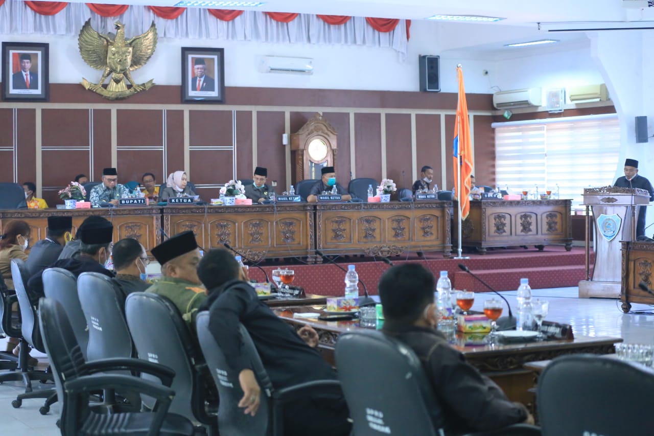 LABUHANBATU,(HALUANPOS.COM)-Bupati Labuhanbatu H.Andi Suhaimi Dalimunthe, ST. MT. menghadiri rapat Paripurna dengan agenda penyampaian laporan hasil Reses I DPRD Kabupaten Labuhanbatu masa persidangan I Tahun sidang II Tahun 2020-2021, Kamis (21/1/201) di ruang rapat paripurna DPRD Kabupaten Labuhanbatu.