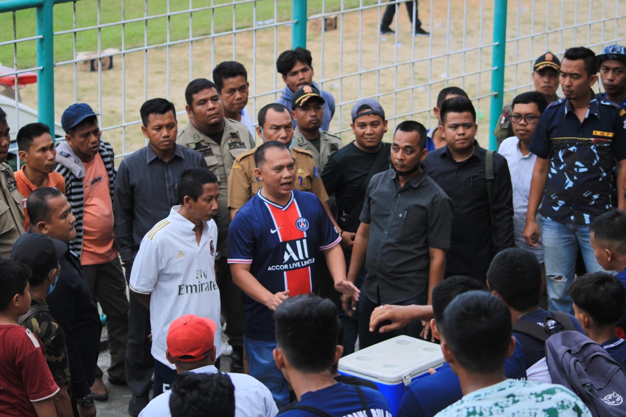 LABUHANBATU (HALUANPOS.COM)-Melihat sengitnya pertandingan antara kedua tim saat pertandingan turnamen sepak bola ramadhan cup yang memperebutkan piala Bupati Labuhanbatu. Bupati Labuhanbatu dr. H. Erik Adtrada Ritonga, MKM Memberikan Nasehat kepada Kedua tim sepak bola seusai bertanding, di stadion Binaraga. Senin (23/05/2022).