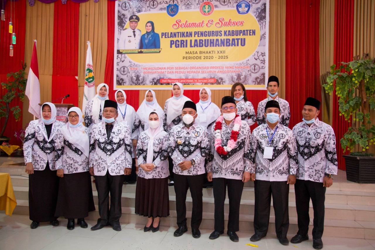 (HALUANPOS)-Bupati Labuhanbatu H. Andi Suhaimi Dalimunthe, ST.MT didampingi Ketua Tim Penggerak PKK Labuhanbatu Ny. Hj. Rosmanidar Andi Suhaimi menghadiri Pelantikan Persatuan Guru Republik Indonesia (PGRI) Kabupaten Labuhanbatu Masa Bhakti XXII Periode 2020 – 2025 di Aula Hotel Permata Land Jalan WR.Supratman Rantauprapat Kecamatan Rantau Utara Kamis (14/2021).Dari pimpinan sebelumnya pada periode 2016-2020 Slameto S.Pd kepada H.Rasonah Dalimunthe, S.Pd.untuk kepemimpinan periode 2020-2025.