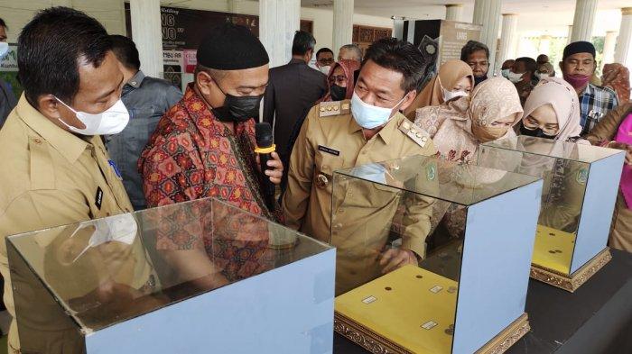 Usai menggunting pita, bupati dan undangan yang hadir melihat sebanyak 63 koleksi uang kuno berbentuk koin dan kertas yang dipamerkan.