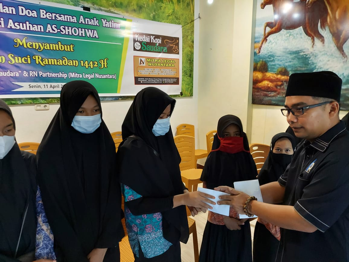 Acara dimulai dengan memberikan tausyiah singkat oleh Ustadz Rahmad Alamsyah LLM dan doa bersama serta pemberian santunan kepada anak yatim panti asuhan As-Shohwa serta makan bersama.