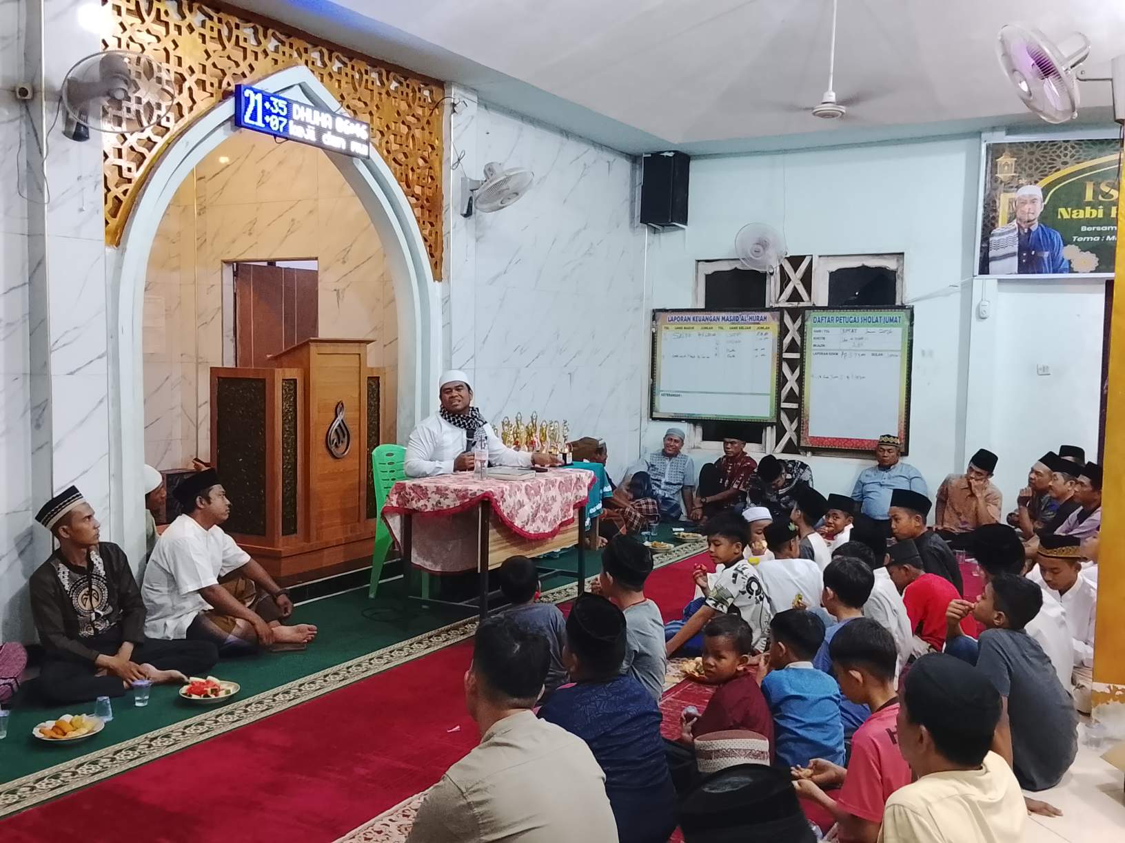melakukan perjalanan malam dari Masjidil Haram ke Masjidil Aqsa (Isra), lalu naik menembus langit hingga Sidratul Muntaha (Miraj) untuk menerima perintah salat lima waktu. Selain itu, Al ustadz mengajak berbuat baik, sebab amal baik kita akan menyelamatkan kita diakhirat. Dan bagi orang tua wajib mendidik dan membimbing anak kita agar selamat dunia akhirat.
