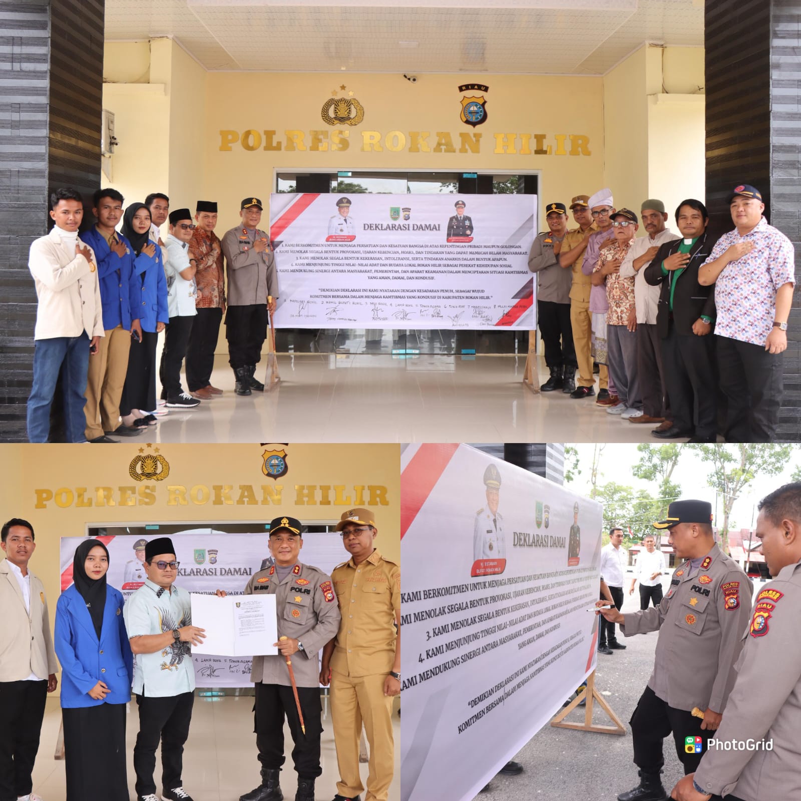 ROKAN HILIR ( HALUANPOS.COM ) Polres Rokan Hilir Menggelar Deklarasi Damai untuk mengantisipasi Aksi Unjuk RASA solidaritas Dijakarta, Deklarasi Tersebut Digelar di Lobby Tathya Dharaka Mapolres Rokan Hilir Senin 1/9/2025.