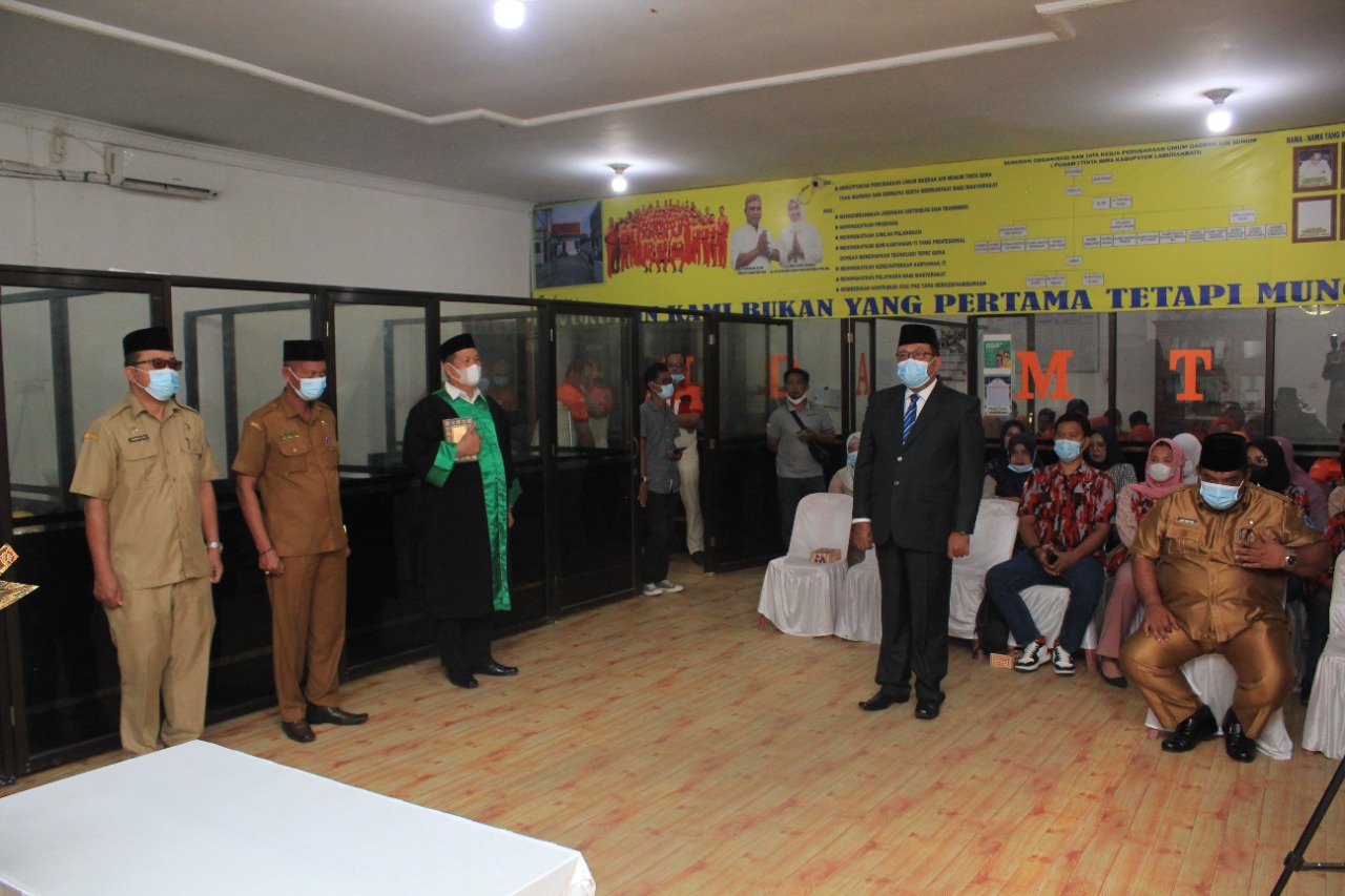 Pengangkatan Dirut dari pejabat lama Zaid Harahap kepada pejabat baru Paruhum Nali Siregar di pimpin Sekdakab Labuhanbatu Ir.Muhammad Yusuf Siagian MMA, Disaksikan Asisten I Pemerintahan dan Kesra Drs.Sarimpunan Ritonga, M.Pd, Plt Asisten II perekonomian dan pembangunan Ikram Syah Putra Nasution diaula PUDAM Tirta Bina Labuhanbatu jalan WR.Supratman Rantauprapat Kecamatan Rantau Utara Senin 29/5/2022.