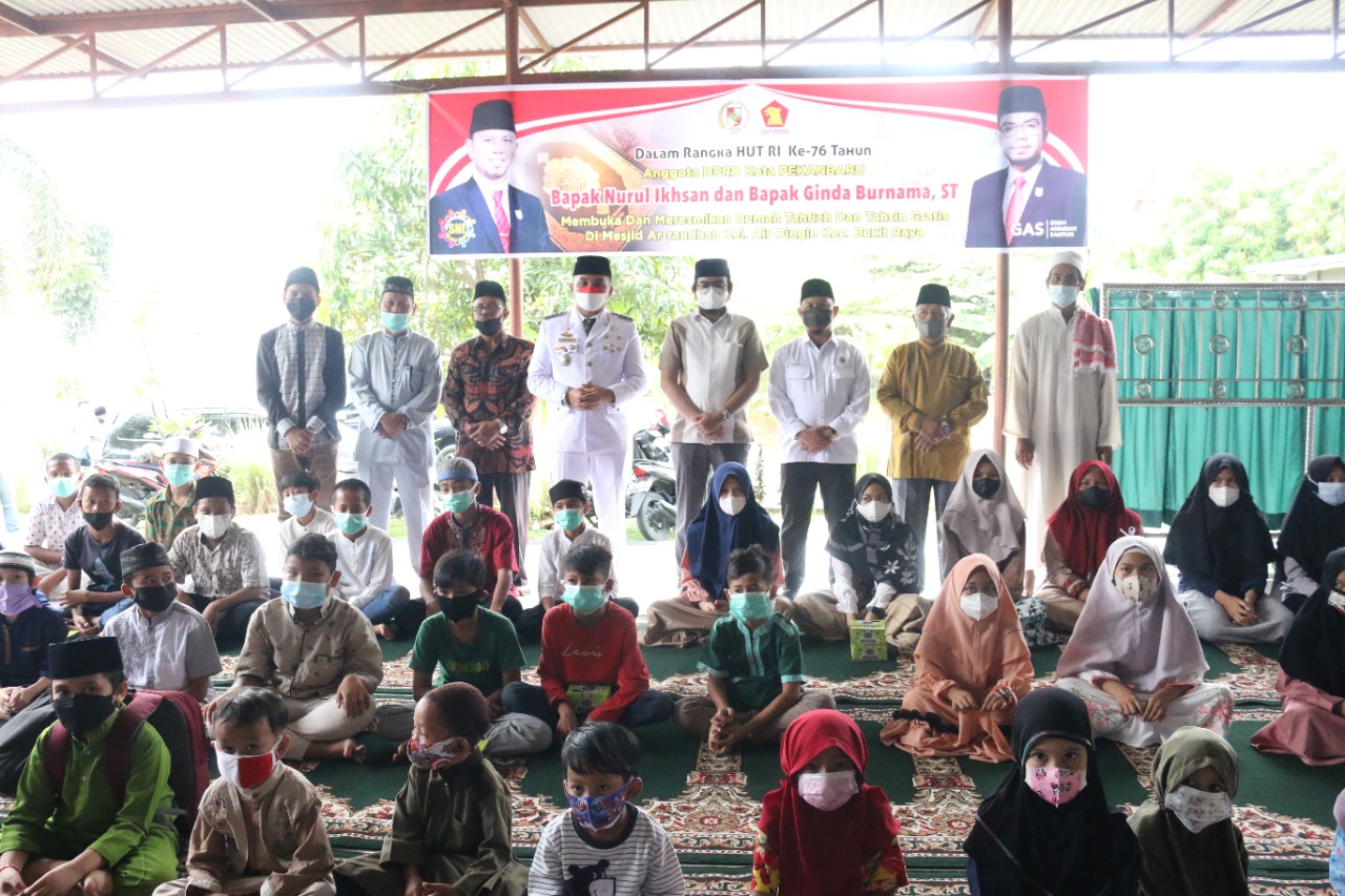 Selain meresmikan rumah tahfiz dan tahsin, kedua politisi Gerindra ini memberikan kado HUT RI Ke-76 tahun kepada 37 santri rumah tahfiz dan tahsin serta warga di masjid Ar-Raudhah Kelurahan Air Dingin Kecamatan Bukit Raya, Selasa(17/8/21).