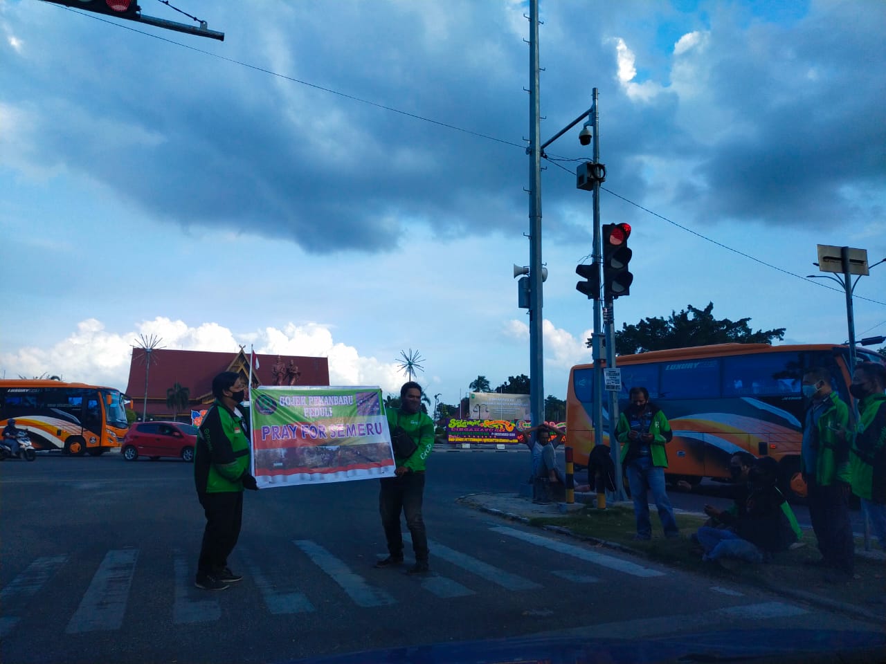 Setiap lampu merah, mereka bentangkan spanduk bertuliskan, “Gojek Pekanbaru Peduli Pray For Semeru” dan sebagian anggota lainnya menyodorkan kotak kardus kesetiap pengendara yang berhenti.
