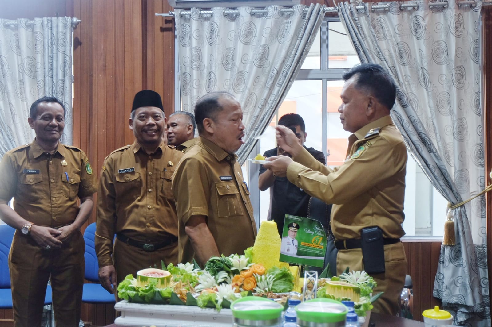 Momen itu pun dirayakan sederhana oleh sejumlah pejabat, ASN dan honorer dengan pemotongan kue dan tumpeng di di ruang kerja Plt. Bupati, Senin (8/5/2023).