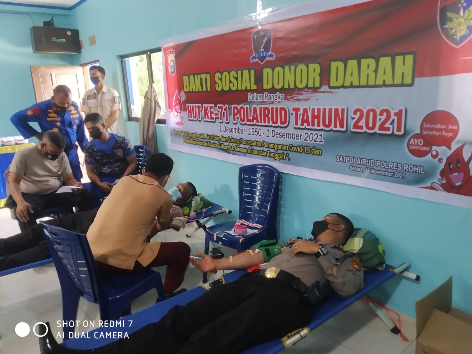 BAGANSIAPIAPI (HPC) Rangkaian Penyambutan HUT Polairud ke-71 tahun, satuan Polisi air (Satpolair) Polres Rokan Hilir (Rohil) mengikuti gelar Bhakti Sosial Donor Darah di mako Polairud Selasa 16 November 2021.