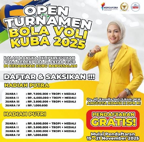 PEKANBARU, – Open Turnamen Bola Voli Kuba 2025 yang akan diselenggarakan 22 November sampai dengan 13 Desember di Kecamatan Kubu Babussalam, Kabupaten Rokan Hilir (Rohil), Riau jadi ajang unjuk prestasi atlet muda berbakat. Event yang diusung Kementerian Pemuda dan Olahraga (Kemenpora) RI bersama Pengcab PBVSI Rohil ini akan dihadiri langsung Anggota Komisi X DPR-RI, Dr Hj Karmila Sari, SKom, MM, pada kick off 22 November 2025 nanti.