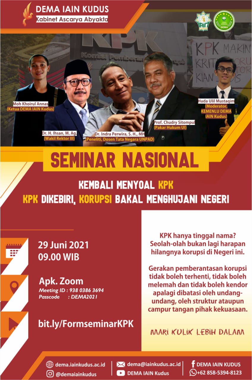 KUDUS (HALUANPOS.COM)- Dewan Eksekutif Mahasiswa (DEMA) Institut Agama Islam Negeri (IAIN) Kudus kembali hadir menyoal KPK dalam bingkai Seminar Nasional Dengan Tema “KPK di kebiri, Korupsi bakal menghujani negeri”. Selasa, (29/06/21) mendatang.