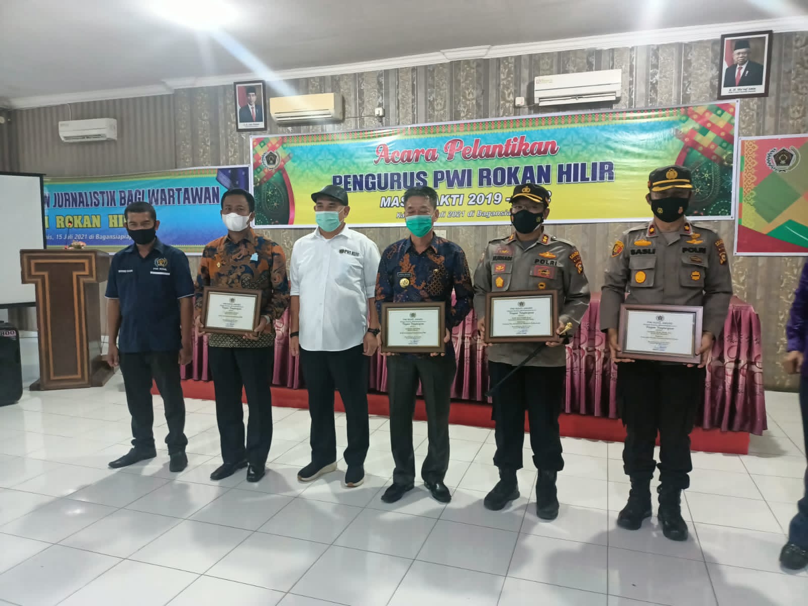 Selain itu ketua PWI Rohil Juga Memberikan Piagam penghargaan Kepada Bupati dan wakil bupati kapolres dan dandim 0321 Rohil.