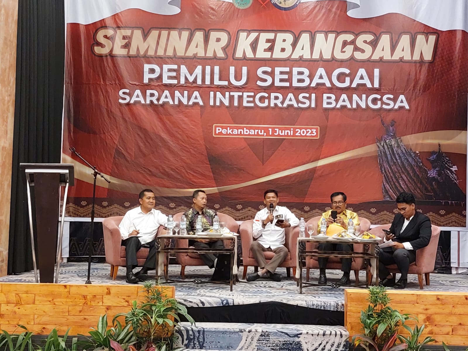 Drs. H. Syamsuar, M.Si Gubernur Riau, menegaskan bahwa Pemilu bisa menyatukan bangsa dan Pemilu juga bisa menjadi perpecahan Bangsa, Seminar Kebangsaan ini bertepatan dengan 1 Juni, hari kelahiran Pancasila, diharapkan adek-adek mahasiswa dapat memberikan pencerahan kepada masyarakat untuk menggunakan hak Pilihnya.