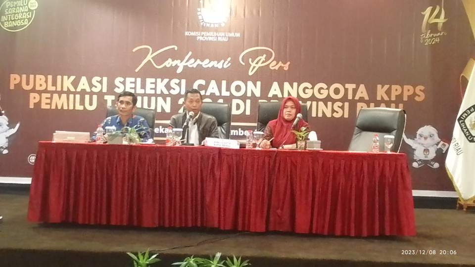 Pekanbaru(Haluanpos.com)-Komisi Pemilihan Umum Provinsi Riau pada Jumat(8/12/23) melaksanakan Konperensi Pers terkait Publikasi Seleksi Calon Anggota KPPS Pemilu Tahun 2024 di Provinsi Riau. Hal ini diungkapkan oleh komisioner KPU Riau, Nugroho Notosusanto.