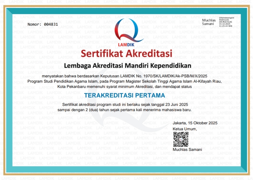 Sertifikat Akreditasi ini berbunyi, Berdasarkan Keputusan LAMDIK No. 1970/SK/LAMDIK/Ak-PSB/M/X/2025 Program Studi Pendidikan Agama Islam Pada Program Magister Sekolah Tinggi Agama Islam Al-Kifayah Riau Kota Pekanbaru Memenuhi Syarat Minimum Akreditasi, dan mendapat Status “Terakreditasi Pertama”.