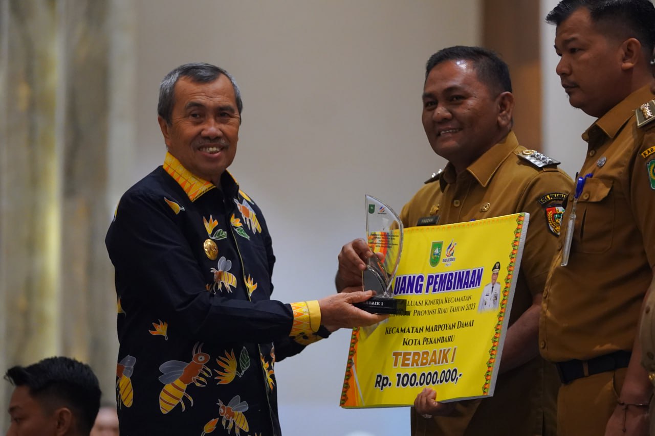 Penghargaan diserahkan Langsung Oleh Gubernur Riau Syamsuar Kepada Camat Marpoyan Damai Fauzan S.STP, M.Si di sela-sela Rapat Kerja Penyelenggara Urusan Pemerintahan Desa se Provinsi Riau, Kamis (02/11/2023).