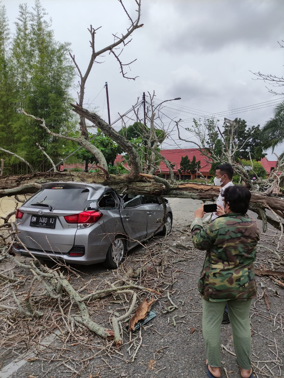 PEKANBARU (HALUANPOS.COM) – Nova (45) tak menyangka nasibnya apes. Mobil jenis Honda Mobilio BM 1480 VJ warna abu-abu miliknya mengalami ringsek usai ditimpa pohon tua yang mendadak tumbang pada Kamis (28/10/2021) siang.