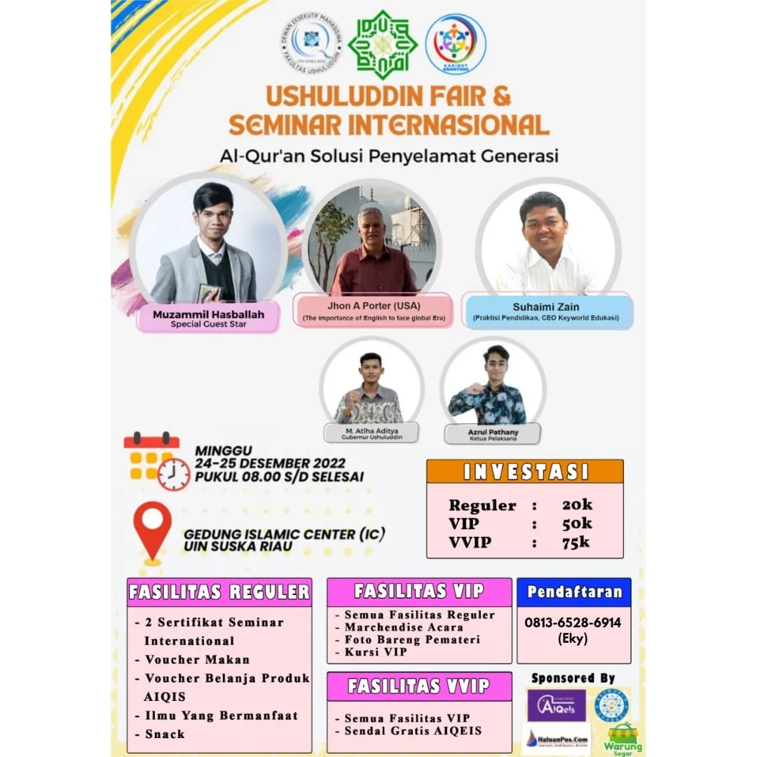 ” Acara Ushuluddin Fair yang sudah berlangsung dari tanggal 15 Desember kemaren sangat meriah, lomba-lomba yang di adakan di ikuti dengan sangat antusias oleh para peserta. Dan acara puncak dari Ushuluddin Fair akan menghadirkan Ustdz ternama Sebagai pemateri utama Ustadz Muzammil Hasballah bergandeng dengan Jhon Ap Porter dari USA, Sebagai pemateri Internasional.” kata Gubernur Fakultas Ushuluddin M. Atlha Aditya, kamis (15/12/2022).