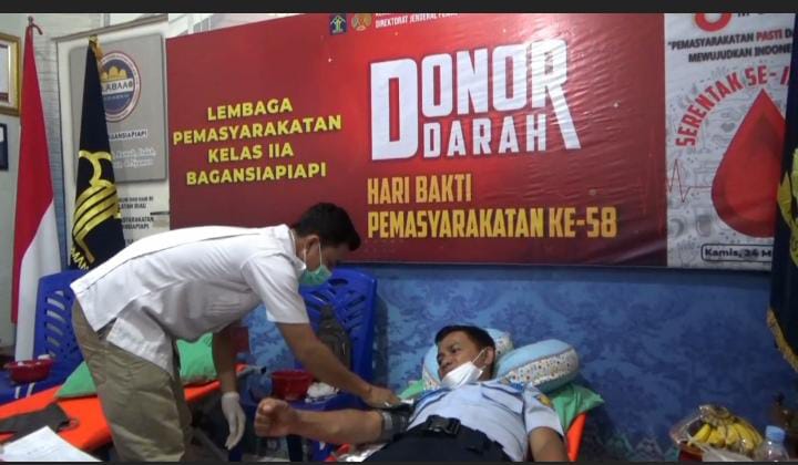 BAGANSIAPIAPI (HPC) – Belasan pegawai Lapas Kelas II A Bagansiapiapi antusias mengikuti aksi donor darah yang digelar berkaitan dengan momen Hari Bhakti Pemasyarakatan (HBP) ke-58 di Bagansiapiapi, Kamis (24/3/2022).