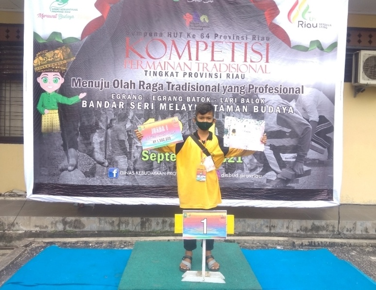 Danil Suhada, pemenang permainan Egrang batok asal Bengkalis mengatakan, Saya merasa sangat senang sekali bisa bersaing dan memenangkan cabang olah raga egrang batok,” ujar Danil Suhada kelas 7 A SMPN 2 Bantan. Selasa(14/9/21)