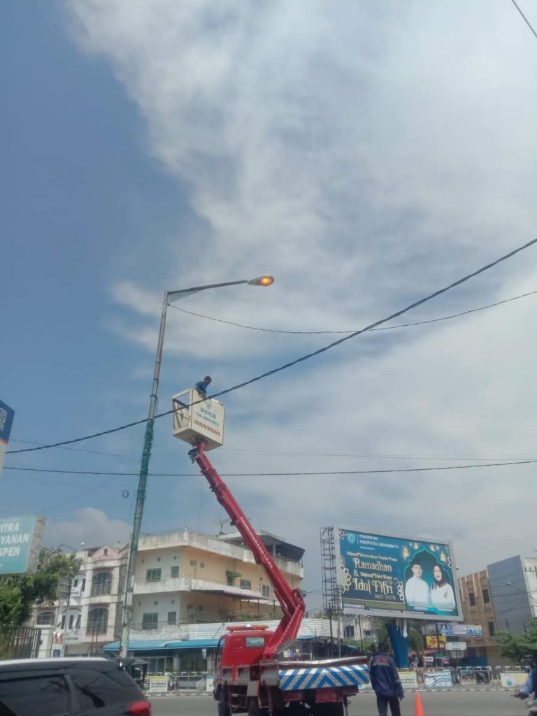 LABUHANBATU (HALUANPOS.COM)-Pemerintah Kabupaten (Pemkab) Melalui Dinas Perhubungan (Dishub) Kabupaten Labuhanbatu berupaya memberikan pelayanan kenyamanan bagi pengguna jalan diseputaran kota Rantauprapat dengan ‘membolo’ dan melakukan pemeliharaan Lampu Penerangan Jalan Umum (LPJU). Adapun lampu yang diperbaiki berada di jalan Patimura dan SM Raja.