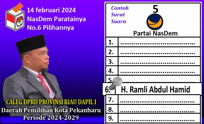 Ustadz H. Ramli, maju melalui Perahu Partai Nasdem Dapil Kota Pekanbaru untuk DPRD Provinsi Riau dan Nama beliau juga sudah terdaftar pada Daftar Calon Sementara (DCS) yang diumumkan KPU.
