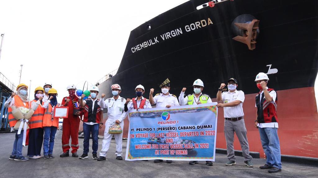 General Manager Pelindo1 Cabang Dumai Jonedi Ramli, menutup tahun 2020 dengan melakukan turun lansung ke dermaga guna memberikan penghargaan dan apresiasi kepada Capt Kapal MT. Chembulk Virgin Gorda, sebagai kapal yang terakhir lepas sandar (last call vessel) pukul 19.00 tanggal 31 Desember tahun 2020 yang bermuatan CPO dengan tujuan pelabuhan ke Haldia di India.