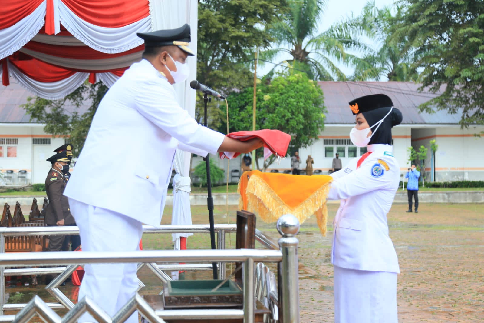 LABUHANBATU (HALUANPOS.COM)-Peringatan HUT Kemerdekaan RI ke-76 di Kabupaten Labuhanbatu diperingati sesuai protokol kesehatan Covid-19, pengibaran Bendera Merah Putih yang digelar di lapangan diklat Badan Kepegawaian Pendidikan dan Pembangunan jalan H.M.Idris Hasibuan Rantauprapat Kecamatan Rantau Selatan Selasa 17 Agustus 2021 itu hanya dihadiri sekitar 100 orang peserta dengan menjaga jarak dan memakai masker.