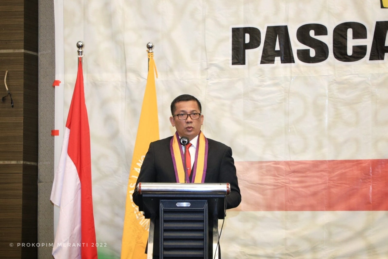 Sambutan kehormatan yang disampaikan M Adil saat menyampaikan pidato sebagai salah seorang peserta pascasarjna pada yudisium XIV Unilak di Ballroom Pangeran Hotel, Selasa (29/3).