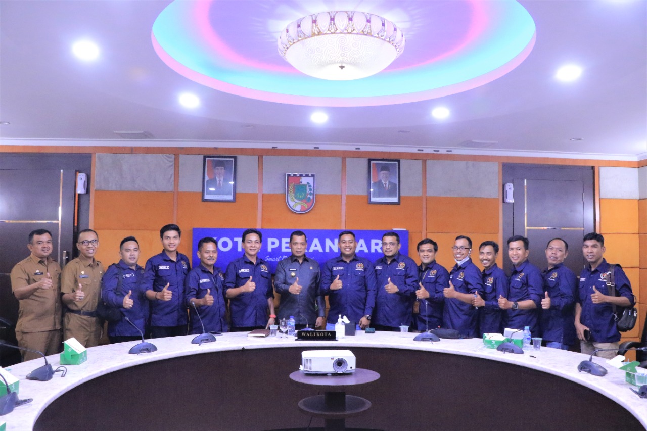 Pj Walikota Pekanbaru Muflihun, didampingi Sekretaris Diskominfo Pekanbaru, Tri Sepna Saputra, dan Kabid IKP Dedi Damhudi menyambut baik kedatangan Pengurus PWI Pokja Pekanbaru.
