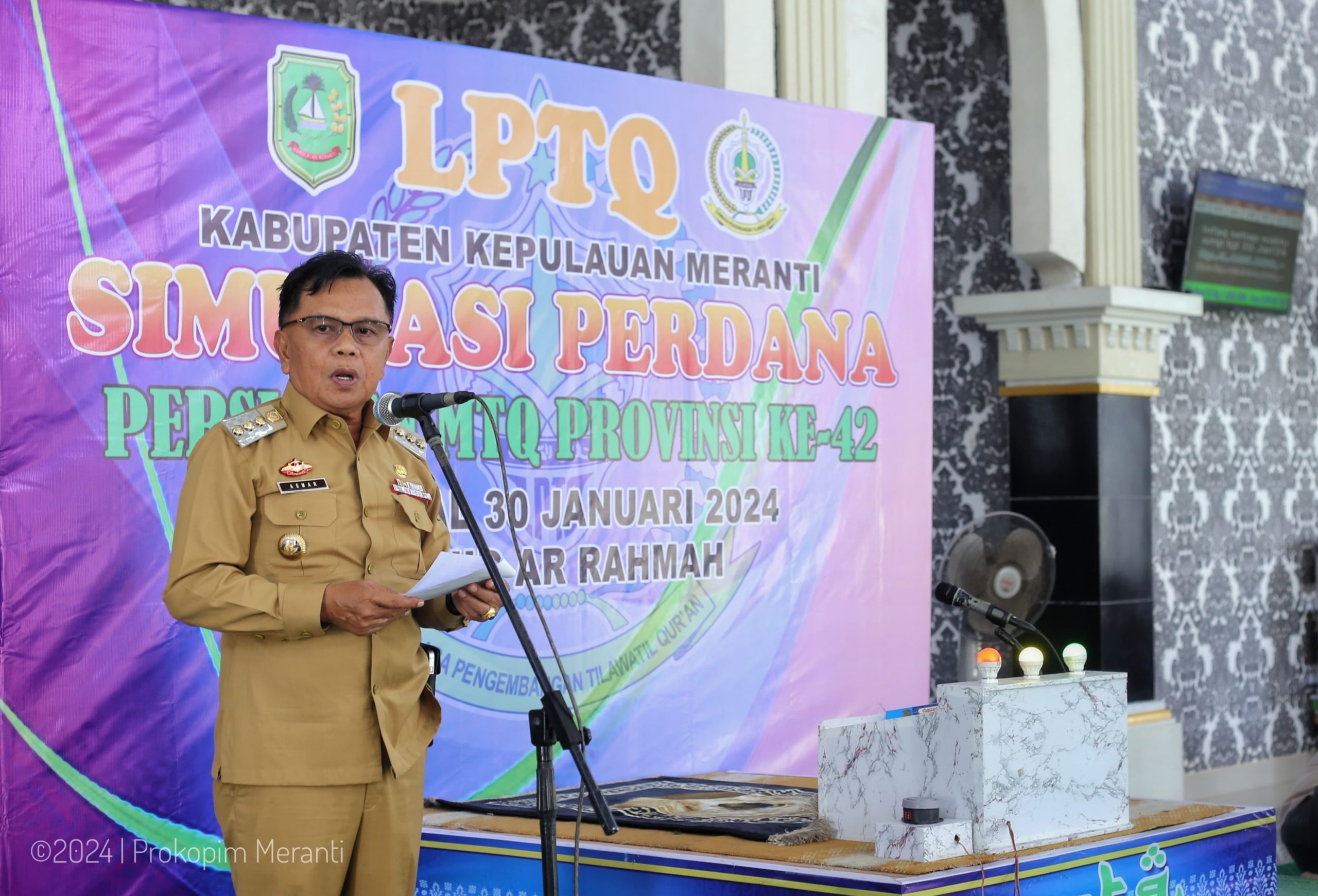 MERANTI (HALUANPOS.COM)-Pelaksana tugas (Plt) Bupati Kepulauan Meranti AKBP (Purn) H. Asmar membuka simulasi perdana persiapan Musabaqah Tilawatil Quran (MTQ) Provinsi Riau ke-42 tahun 2024, bertempat di Masjid Arrahmah Desa Banglas, Selasa (30/1/2024).