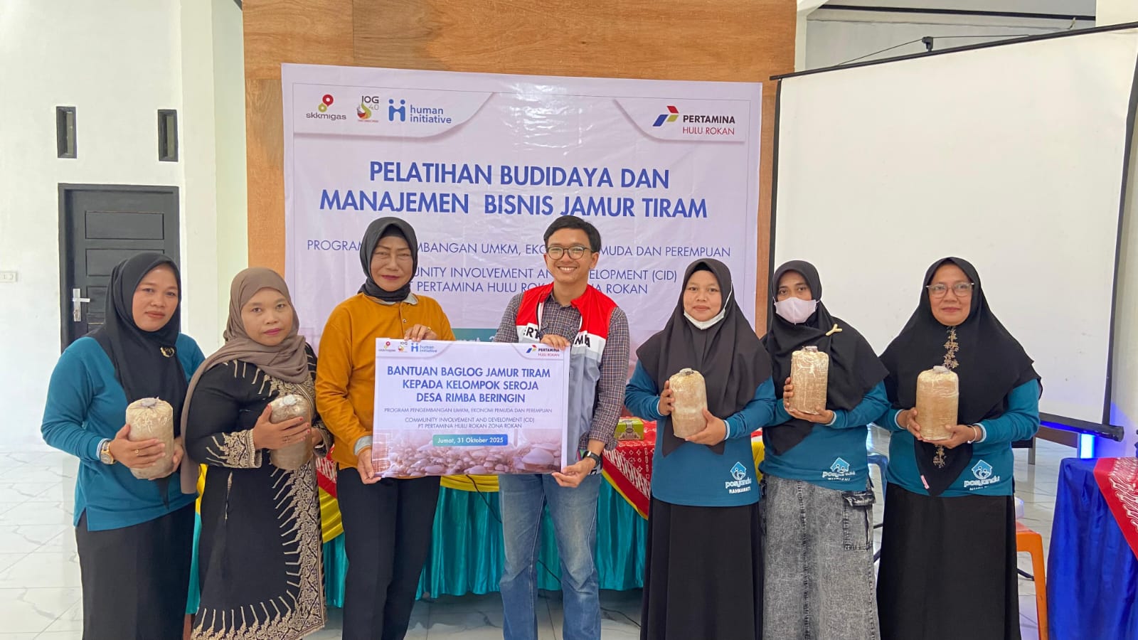 Sebelum pelatihan Pertamina Hulu Rokan menyerahkan bantuan baglog jamur tiram secara simbolis kepada kelompok UMKM Seroja yang didampingi lansung oleh kepala desa Rimba Beringin.