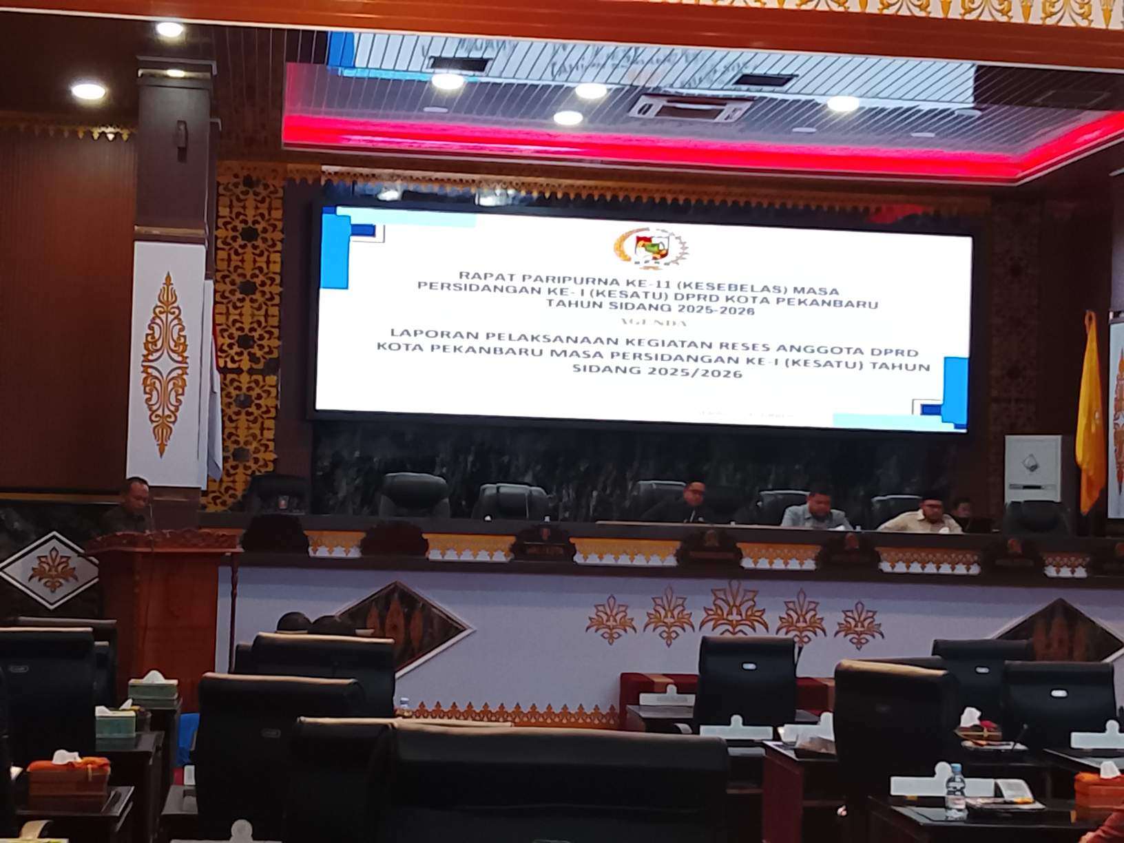 Rapat Paripurna Ke-11 Masa Sidang Ke-I DPRD kota Pekanbaru Tahun Sidang 2025-2026 Tentang Laporan Pelaksanaan Kegiatan Reses Anggota DPRD Kota Pekanbaru Masa Persidangan Ke-I Masa Sidang 2025-2026 diwarnai dengan berpantun. Senin(15/12/25)
