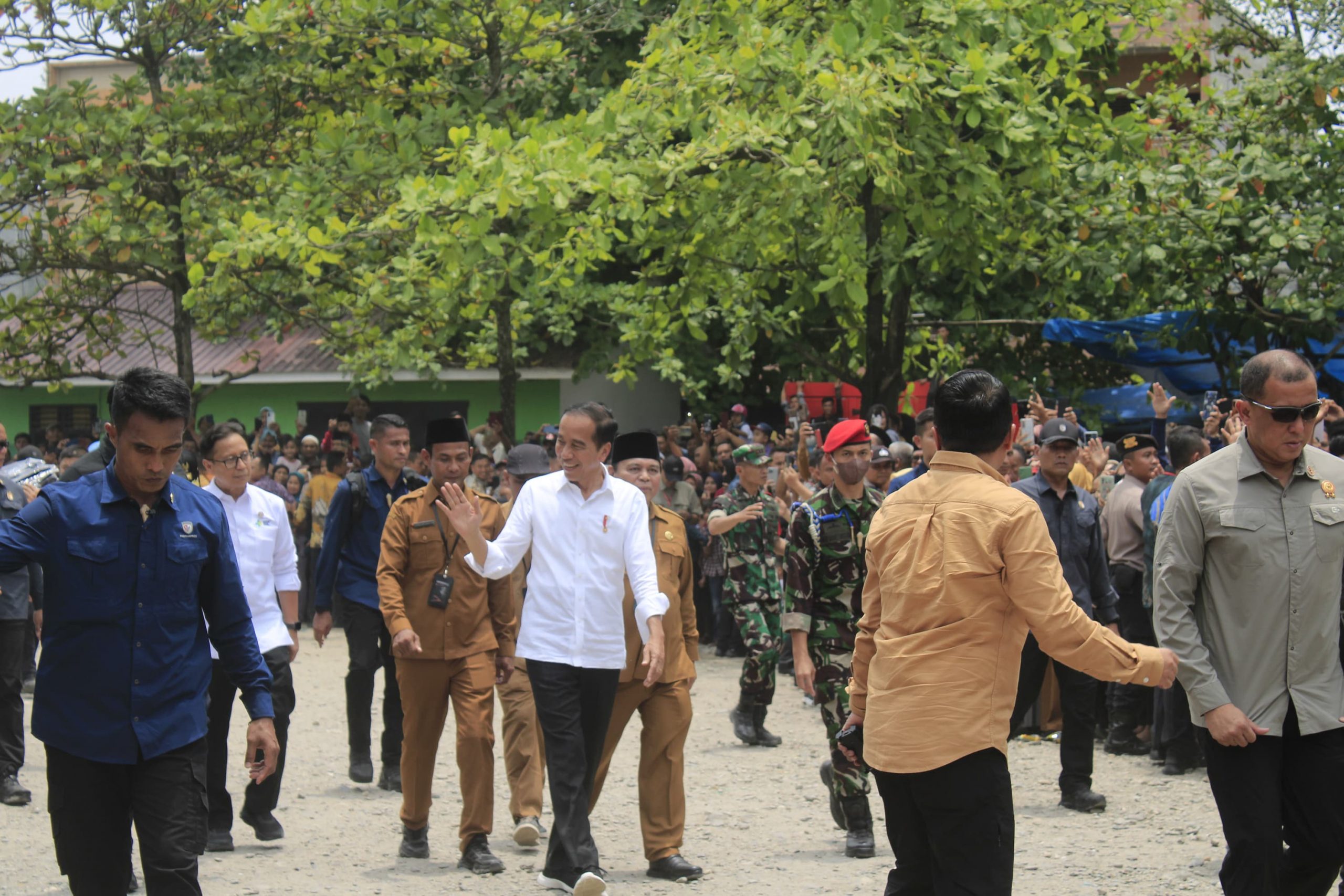 Presiden Jokowi tiba di Labuhanbatu menggunakan Helikopter dengan pengawalan ketat dari Paspampres, meski demikian tidak menyurutkan masyarakat untuk mendekati dan minta foto bersama.