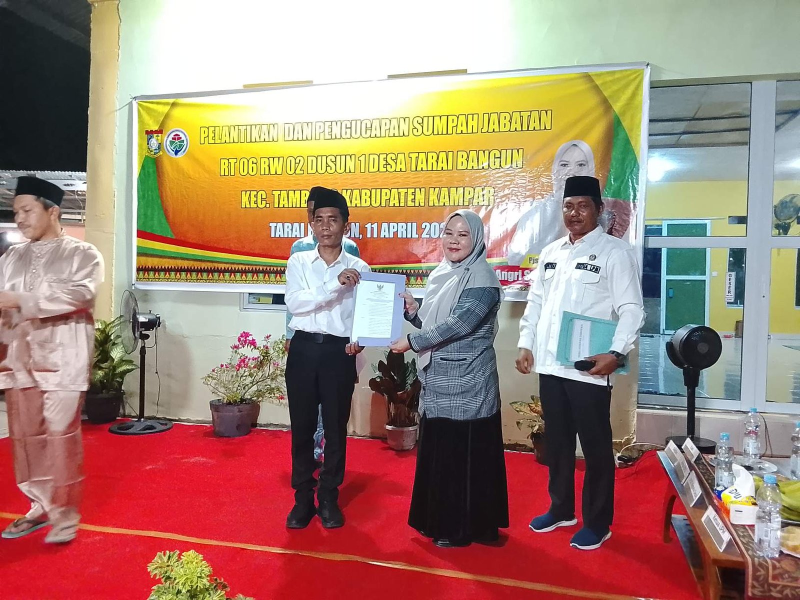 KAMPAR(Haluanpos.com)- Secara resmi, Pjs Kepala Desa Tarai Bangun Angri Septari, S.Pd.SD, M.Si melakukan Pelantikan dan Pengambilan Sumpah Jabatan RT 06, Nirson , S.Sos, RW 02 Dusun 1 Desa Tarai Bangun Kecamatan Tambang Kabupaten Kampar di halaman Mushola Nurul HAQ Perum Bangun Surya Abadi, pada Sabtu malam, 11 April 2026.