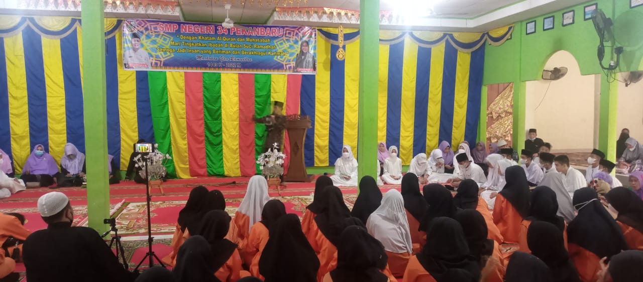 Sri Tuti Wahyuni Selaku Kepala SMP N 34 Pekanbaru mengatakan dalam kegiatan ini bertepatan dengan Nuzul Qur’an serta diadakan Juga Khatam Al-Qur’an, pesanteren kilat ramadhan, serta juga melakukan kegiatan zakat fitrah dari anak anak, dengan tujuan bagaimana anak-anak belajar cara membayar zakat serta Kita juga ada santunan anak-anak yatim yang mana ini kami kumpul dari sedekah dan infak selama ramadhan.