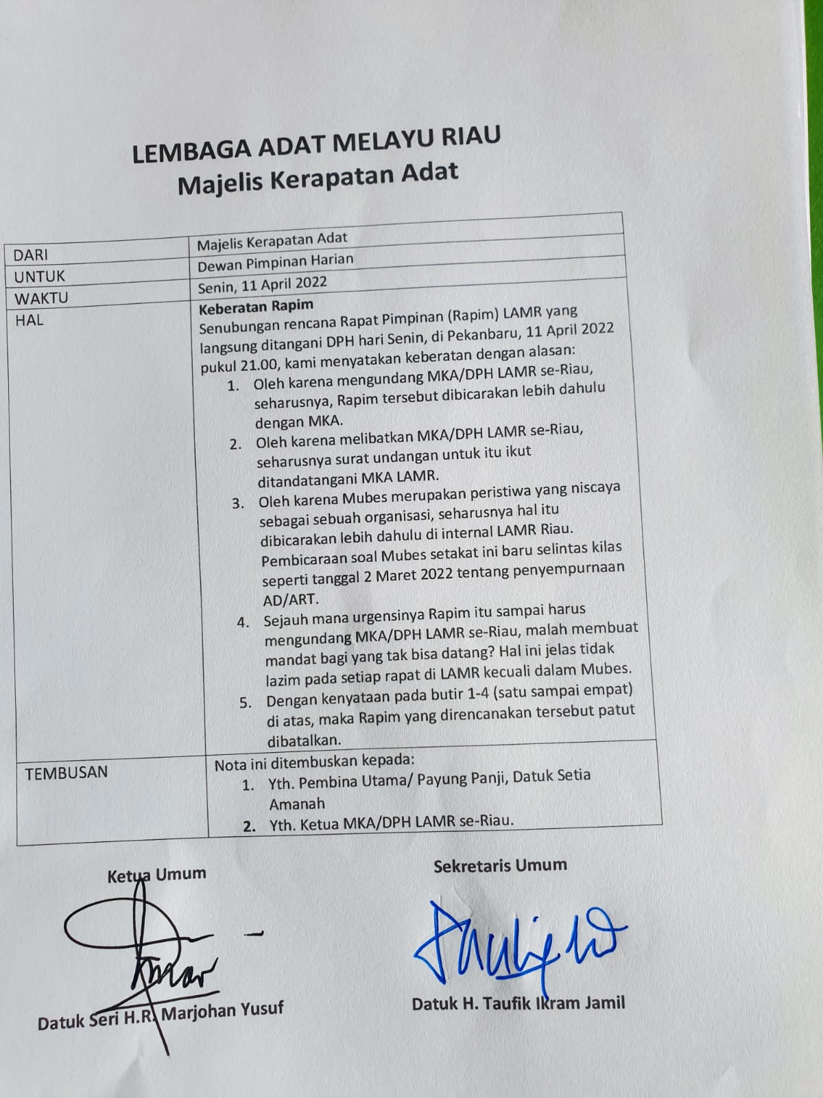 Surat permintaan pembatalan rapat pimpinan MKA/DPH LAMR langsung ditanda tangani oleh Datuk Seri H R Marjohan Yusuf selaku MKA LAMR serta Datuk H Taufik Ikram Jamil selaku sekretaris MKA LAMR.