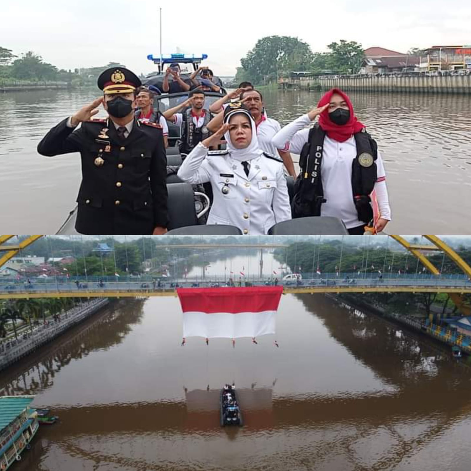 Dengan diiringi lagu Indonesia Raya sang merah putih pun berkibar di atas Sungai Siak.