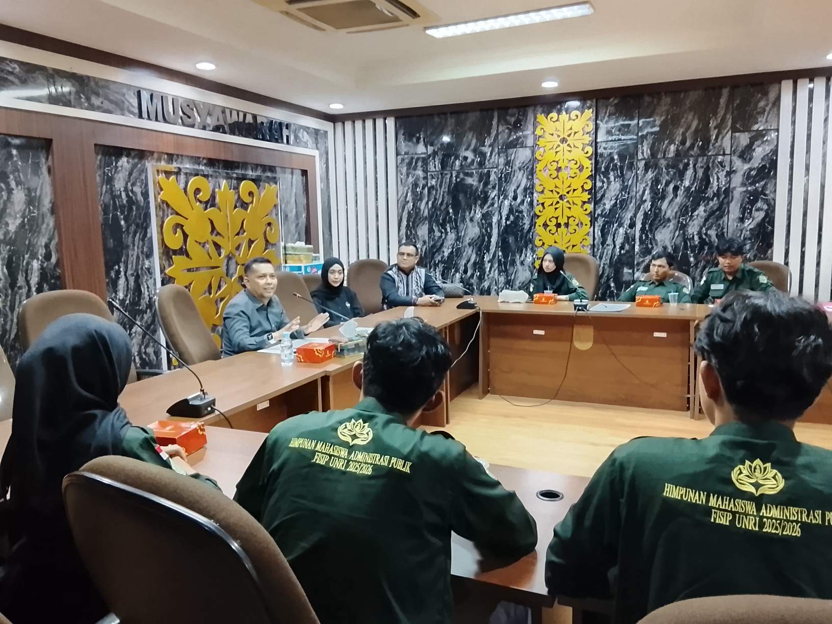 PEKANBARU(Haluanpos.com)- Himpunan Mahasiswa Administrasi Publik (Himanistik) Fakultas Ilmu Sosial dan Ilmu Politik Universitas Riau (FISIP Unri) yang didampingi Ikatan Alumni Administrasi Negara/Publik Fisip UNRI, Senin (15/9/2025) mengelar pertemuan dengan Wakil Ketua DPRD Kota Pekanbaru, Tengku Azwendi Fajri SE MM diruangan Bamus dalam rangka audiensi.